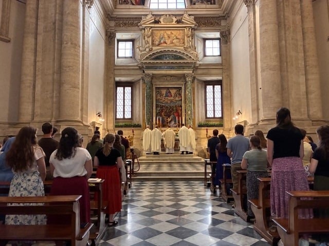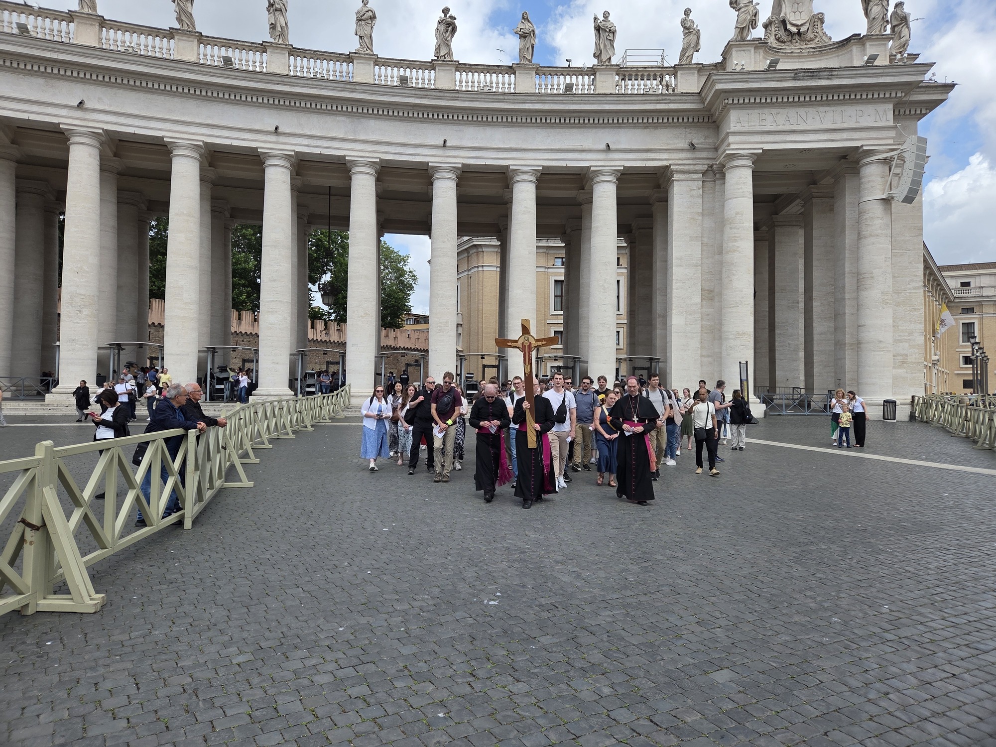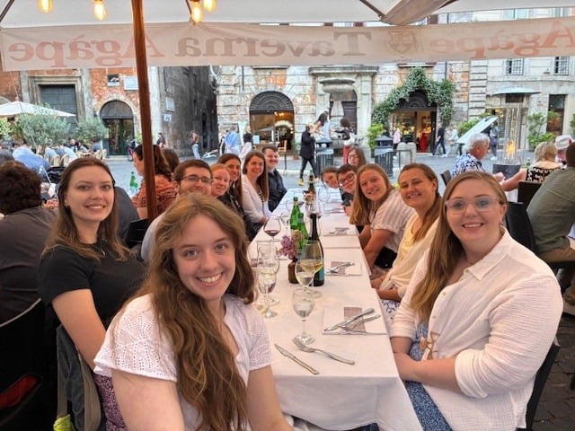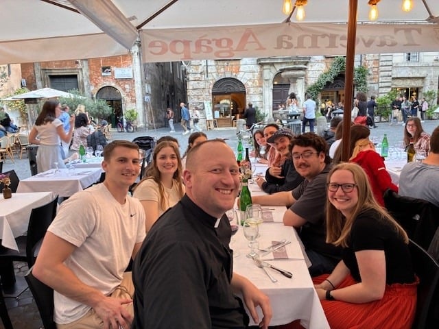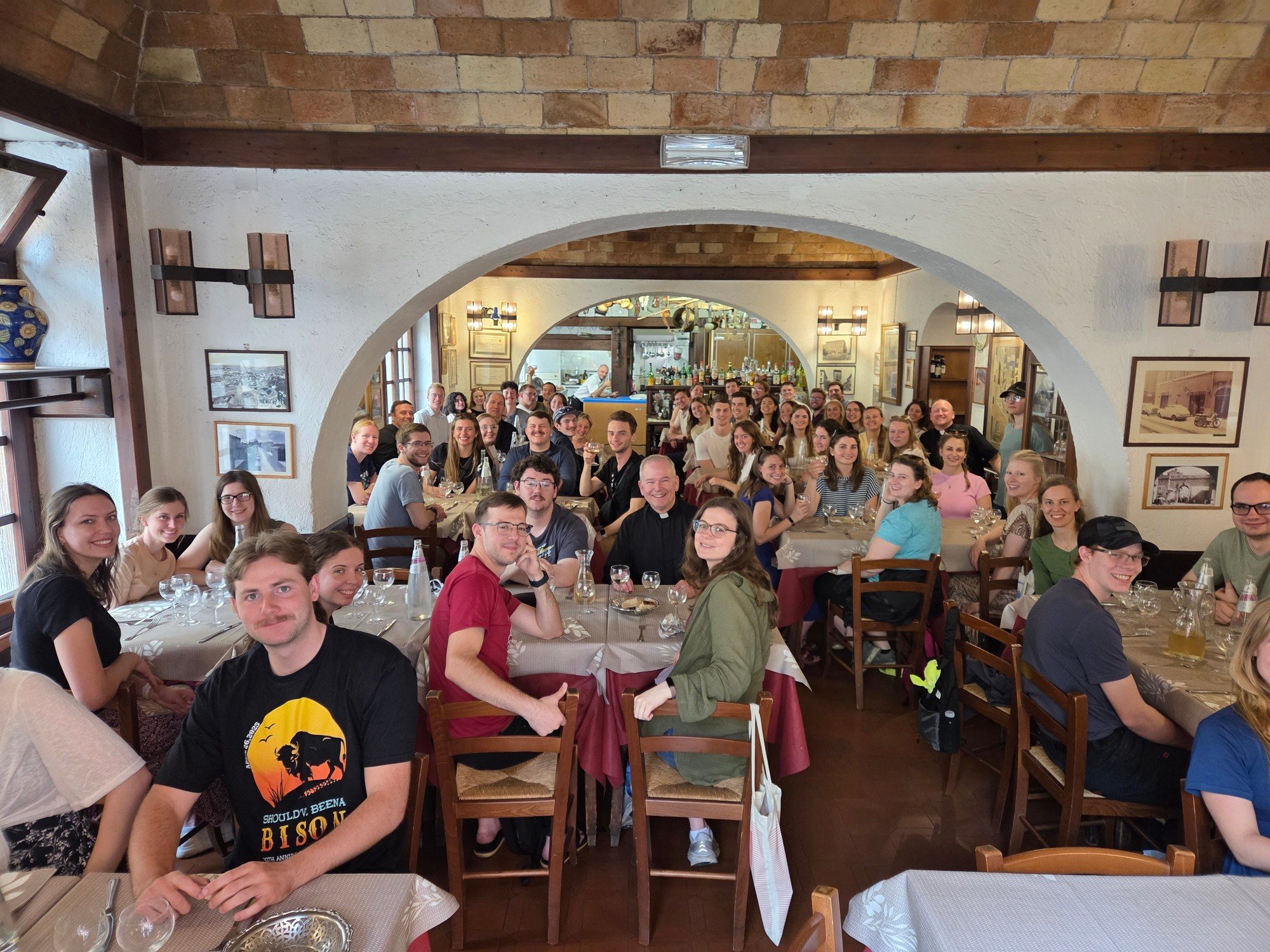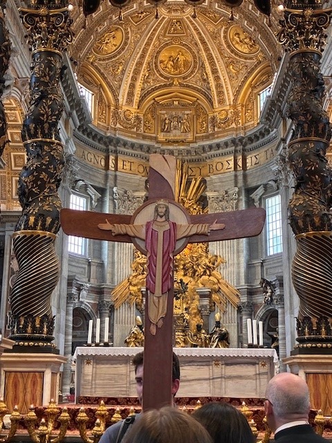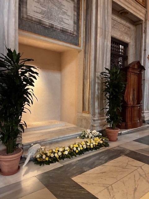 After the procession, the pilgrims went to St. Mary Major and celebrated mass. They were also able to stop and pray at the tomb of Pope Francis. For supper they were in three groups at various local restaurants. It was a great full day. Everyone doing well.