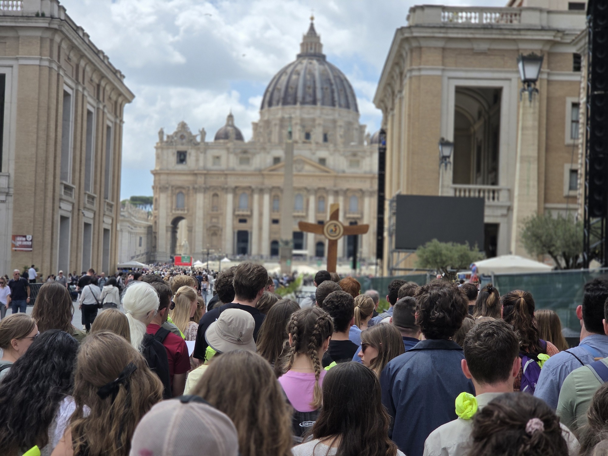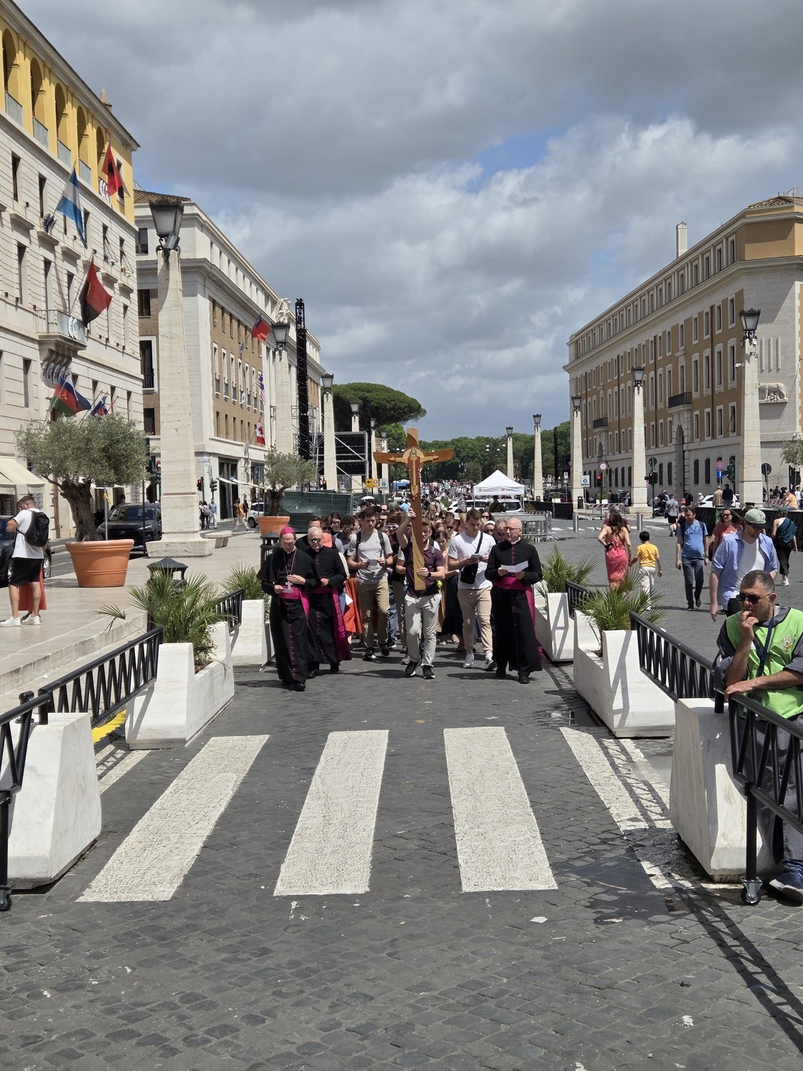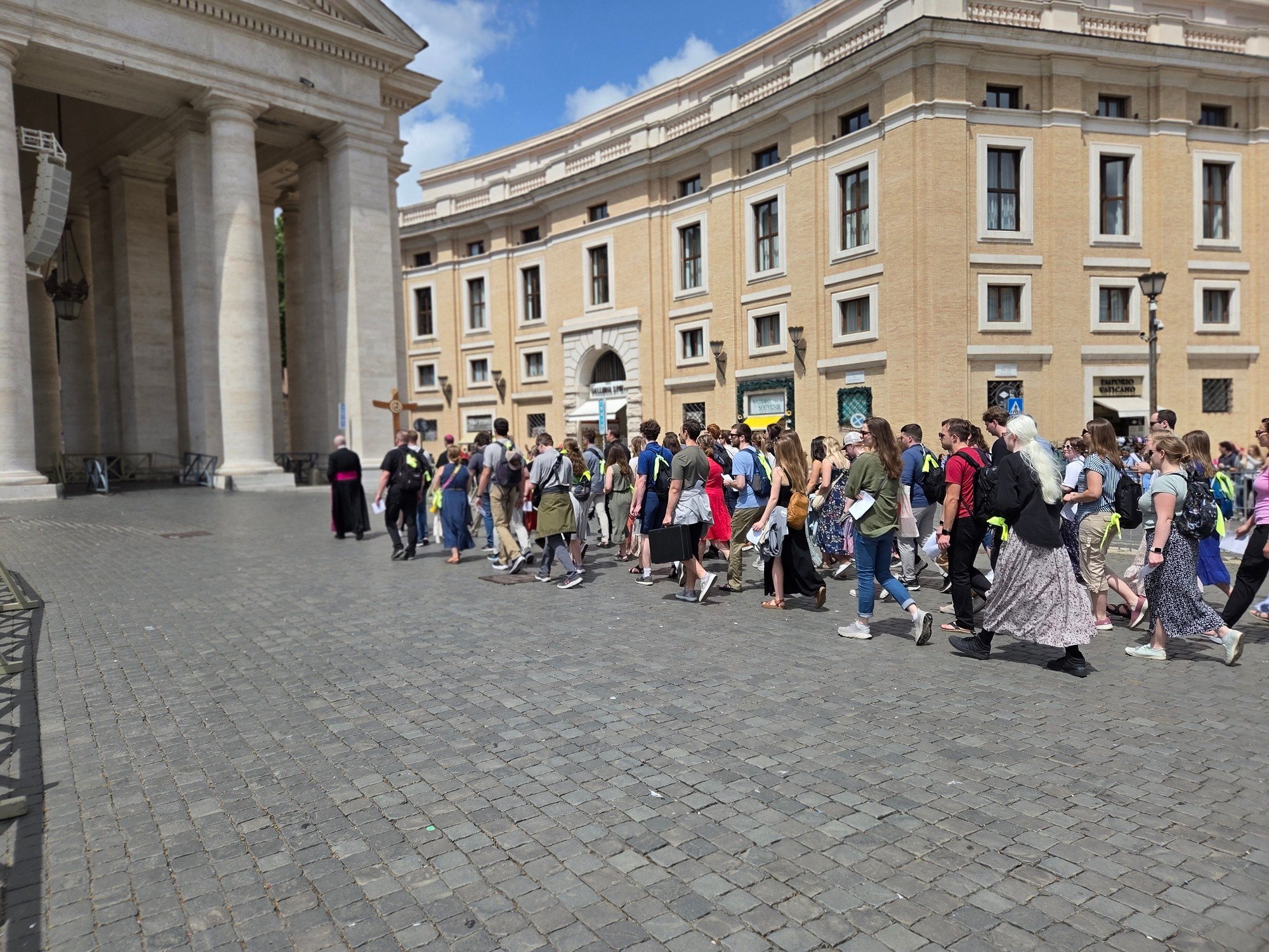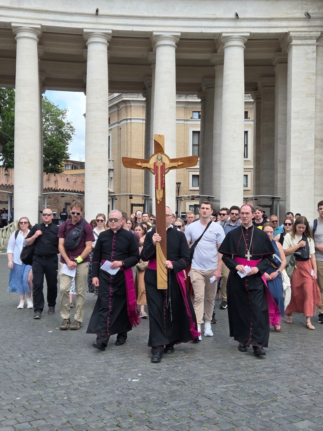 After the procession, the pilgrims went to St. Mary Major and celebrated mass. They were also able to stop and pray at the tomb of Pope Francis. For supper they were in three groups at various local restaurants. It was a great full day. Everyone doing well.