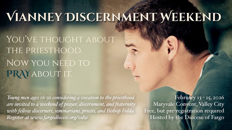 Young men, ages 16-30 are invited to Maryvale Convent in Valley City, ND for one weekend in February of each year to hear about seminary life and the priesthood. If you feel you are open to God's call but have not done anything to actively discern it, then this weekend is for you.